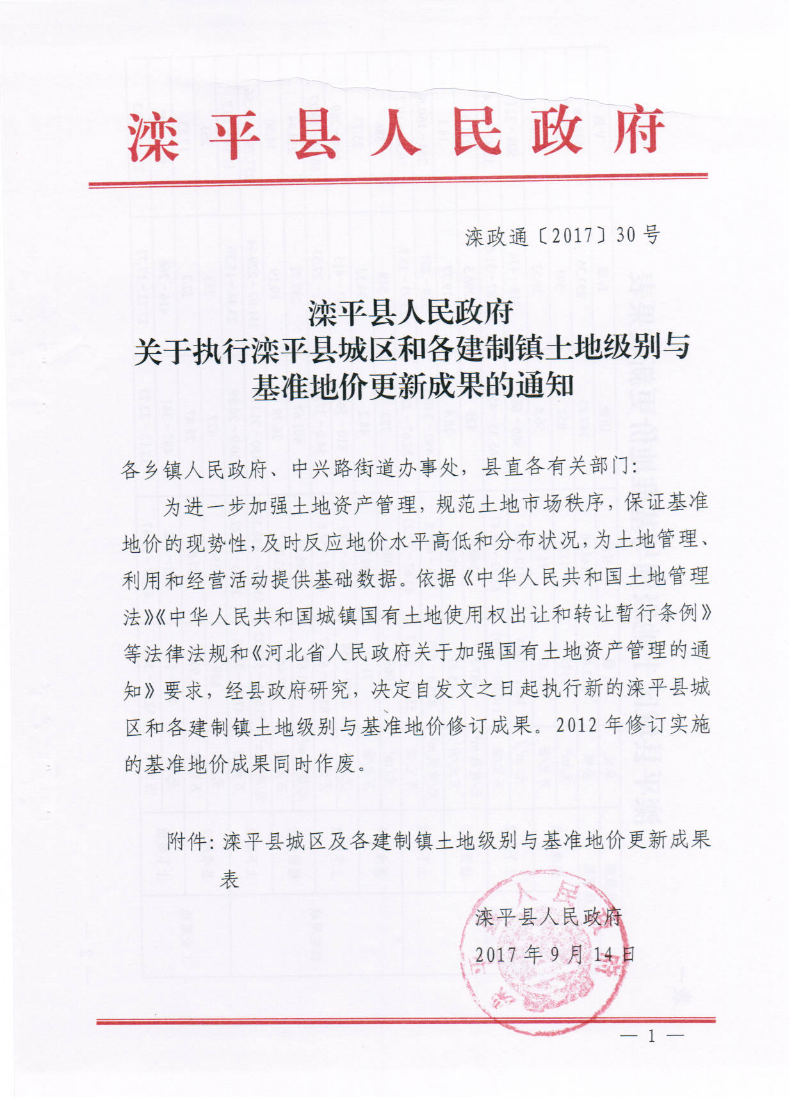 滦平县人民政府关于执行滦平县城区和各建制镇土地级别与基准地价更新成果的通知